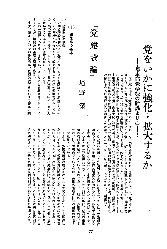 東京都本部は「党建設論」のテーマの下に、去る九月六日から三日問にわたって、党学校を開催した。この都本部党学校は、党をいかに強化・拡大するかという課題を追究して、福島慎吾(専修大学教授)氏の党に対する問題提起にはじまり、四名のレポーターによる報告に基いて一〇〇名に近い参加者が熱心な討論を展開したが、本誌ではこの党学校における四名のレポーター−−−−増野潔(品川総支部)、森永栄悦(中野総支部)、篠藤光行(埼玉県所沢総支部)、広沢賢一(新宿総支都)の報告を加筆の上発言順に二回にわたって収録し、読者の検討に資することにした。紙数と整理の都合上今回は増野潔氏の報告しか収録できなかったことをお断りしておきたい。(編集部)