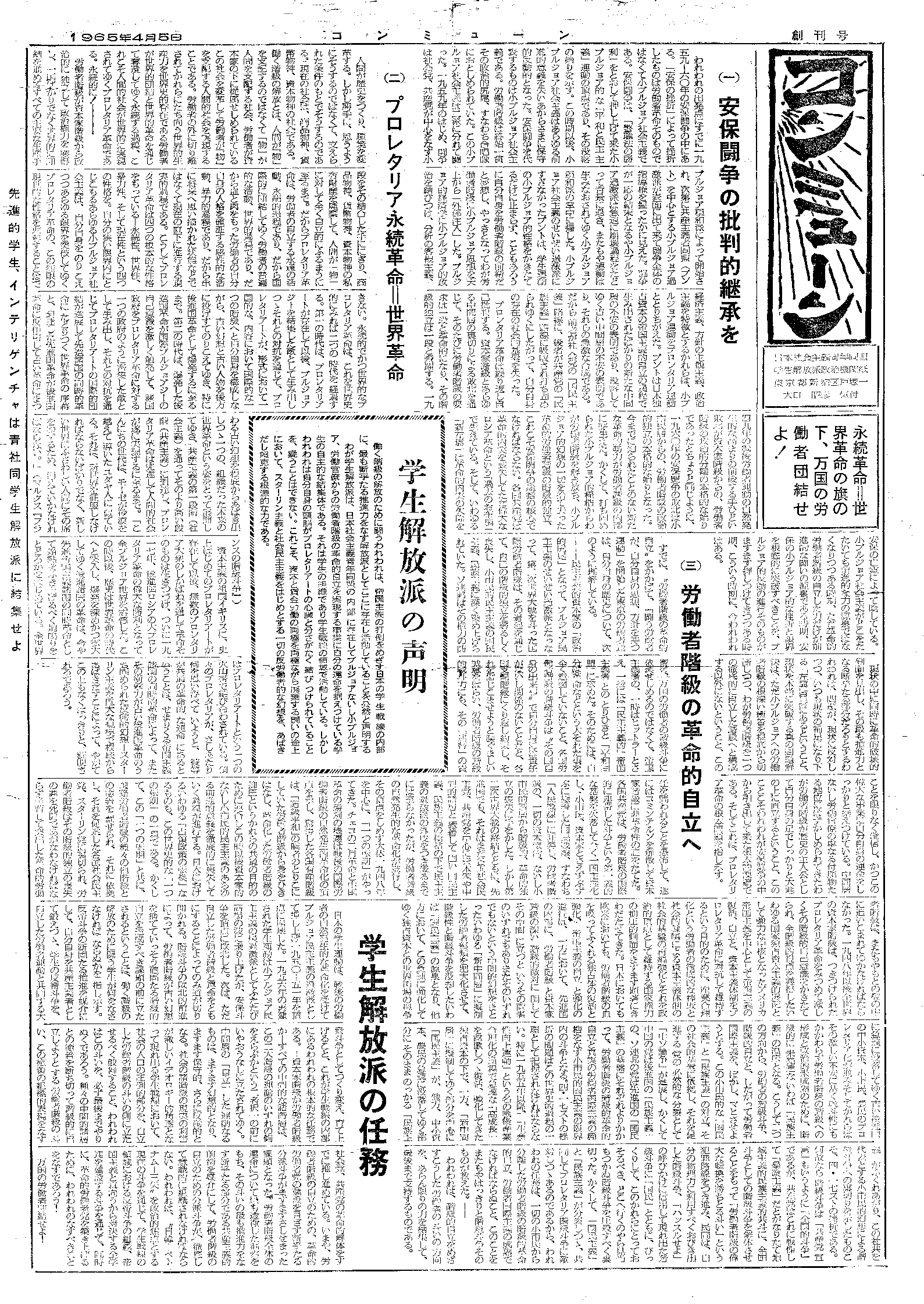 | 65年4月創刊号 | 学生解放派の声明ほか | 1面(『滝口弘人著作集』所収)/2面 タブロイド版・画像(約200K) |
