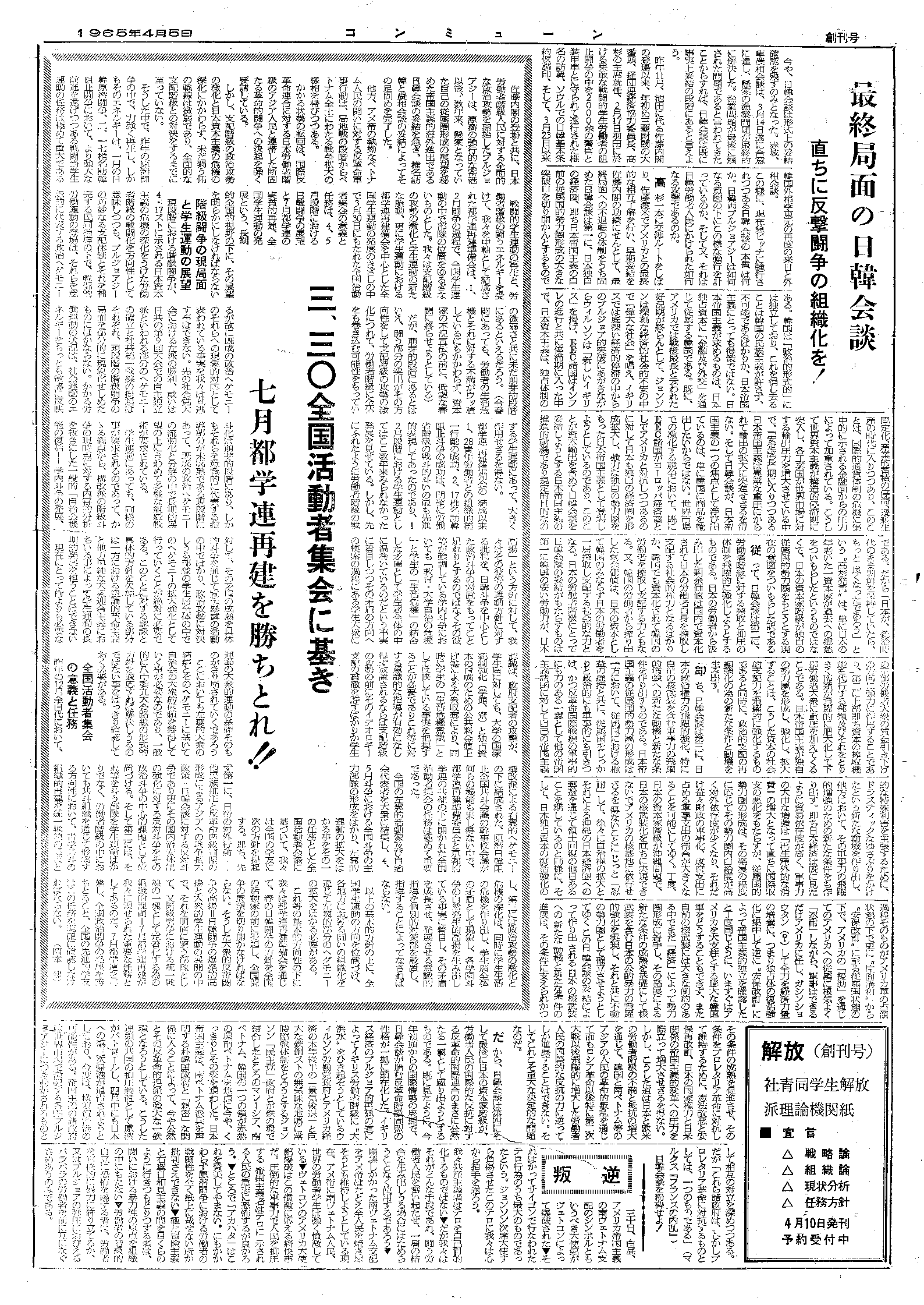| 66年4月15日号 | 階級闘争の現段階と学生運動の任務ほか | ブランケット版4面 |